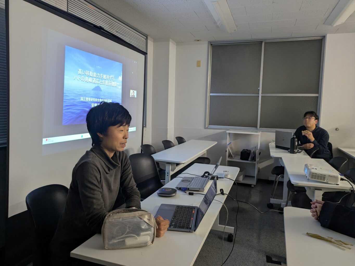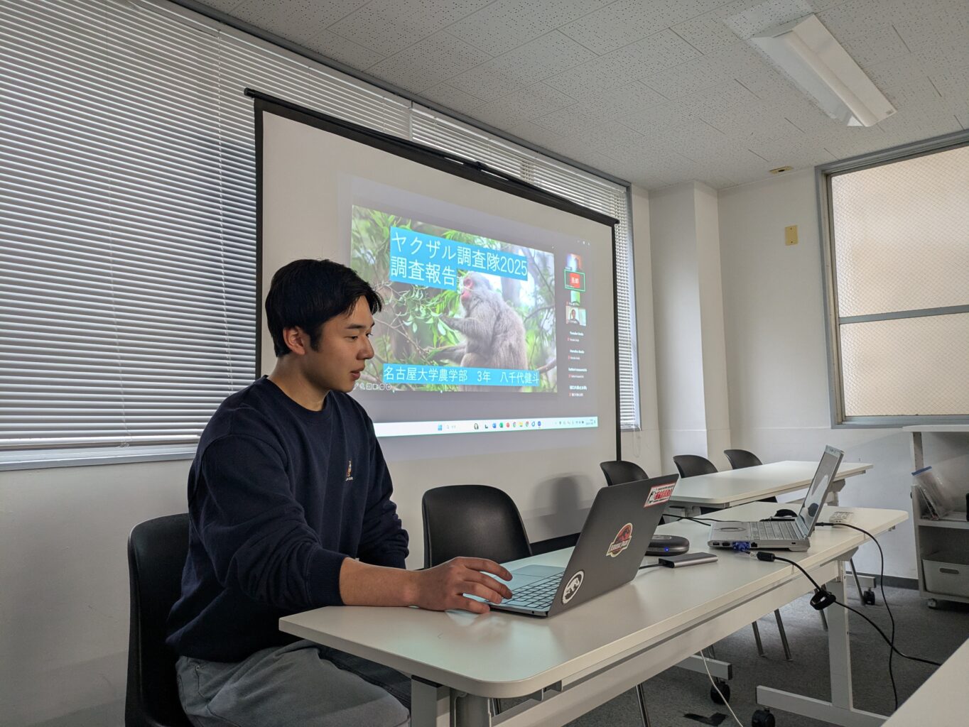まず、2025年のヤクザル調査の様子を、今年の調査員が報告しました。名古屋大学から参加した八千代健斗さんが、調査序盤に起こった車の脱輪と、事務局長の半谷の負傷というふたつの大きなトラブルをどのように乗り切ったかを話し、東京大学の相田麻衣さんが、調査中盤の、穏やかな調査の日々を紹介しました。科学未来館と東北大学でサイエンスコミュニケーションに関わる仕事をされている上田羊介(東北大学、2013-2019年参加)さんは、サイエンスコミュニケータらしく、オンラインツールのDoodleを用いて参加者の皆さんとやり取りをしながら、科学とは何か、生物多様性の価値をどのように一般の人に伝えるべきか、深い議論を展開されました。小笠原でカラスバトを研究するかたわら、ヤクザル調査に参加する大学院時代を過ごした安藤温子さん(国立環境研究所、2009-2013年参加)は、伊豆諸島の島々を自在に行き来するカラスバトの魅力的な生態を紹介しました。
